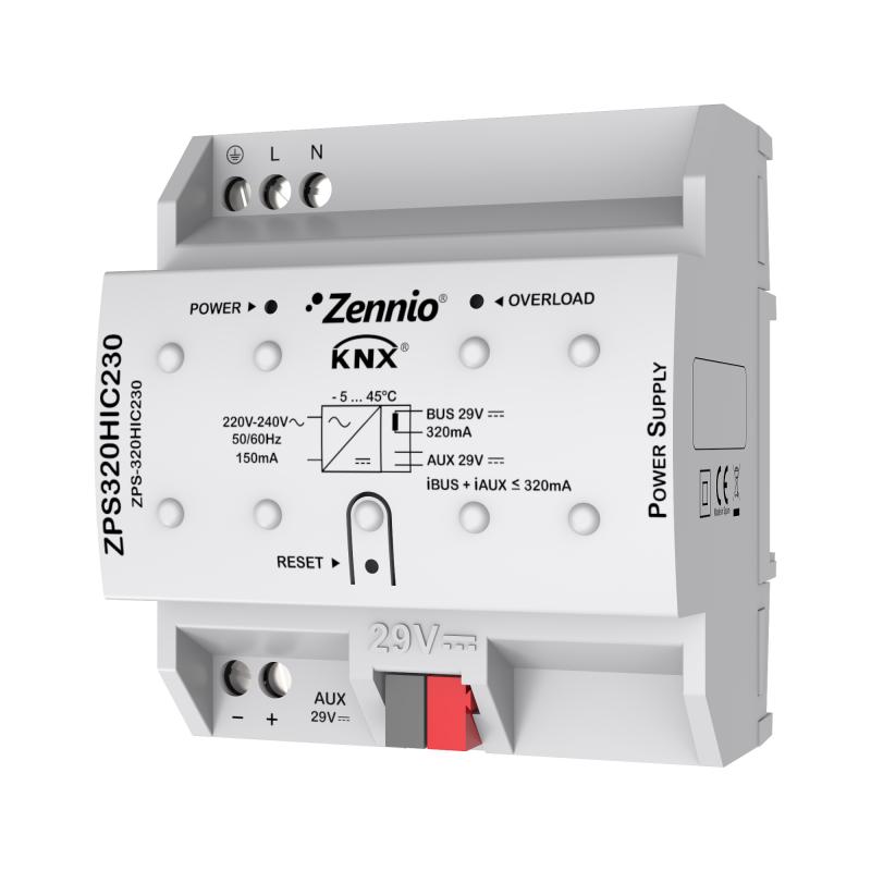 Fonte de alimentação KNX 320 mA com auxiliar de 29 VCC. Vin: 230 VAC